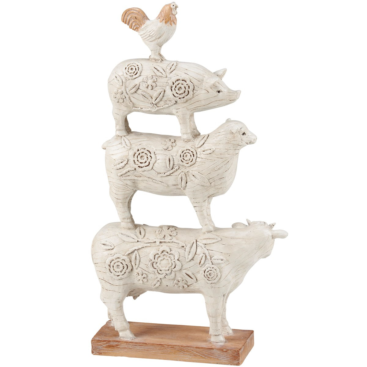 A decorative figurine from our farmhouse collection displaying a fun farm inspired design of farm animals stacked on each other with embossed floral designs and sculpted details throughout. Farm animal figurine features a simple finish that easily blends with a variety of color palettes. Our Stacked Farm Animals figurine is ideal for a rustic home accent and complements well with other pieces in the collection to create a cohesive display.